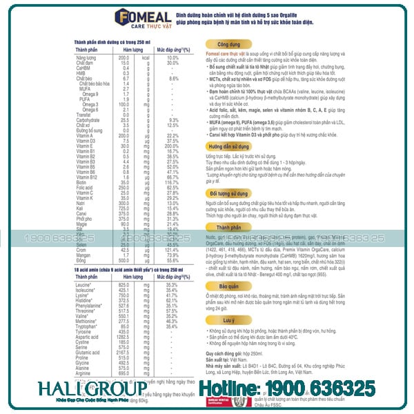 Thành phần dinh dưỡng có trong 250 ml Fomeal Care